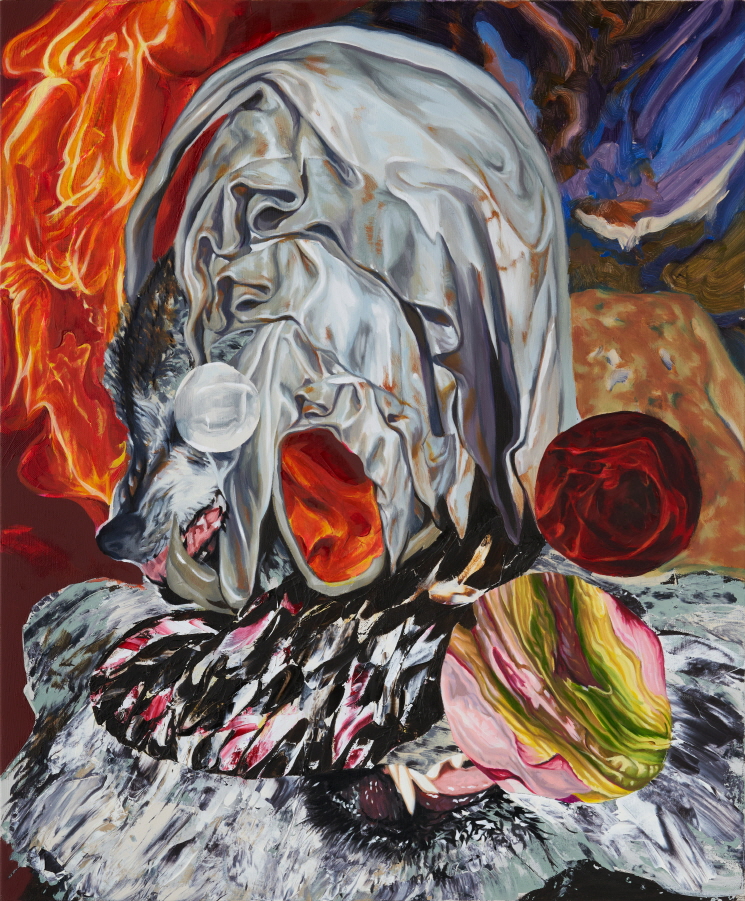 성모 마리아의 머리를 감싼 베일과 옆에서 삐져 나온 늑대 주둥이를 정중앙에 위치한 2023년 신작 〈Park's Land 27〉로부터 작가의 미적 실마리를 읽어본다. 시기 별 테마 연작을 발표한 그의 근래 연작 타이틀은 ‘Park’s Land’. 박정혁의 미적 세계, 박정혁의 미적 영역 정도로 의역해도 무리는 아닐 게다.