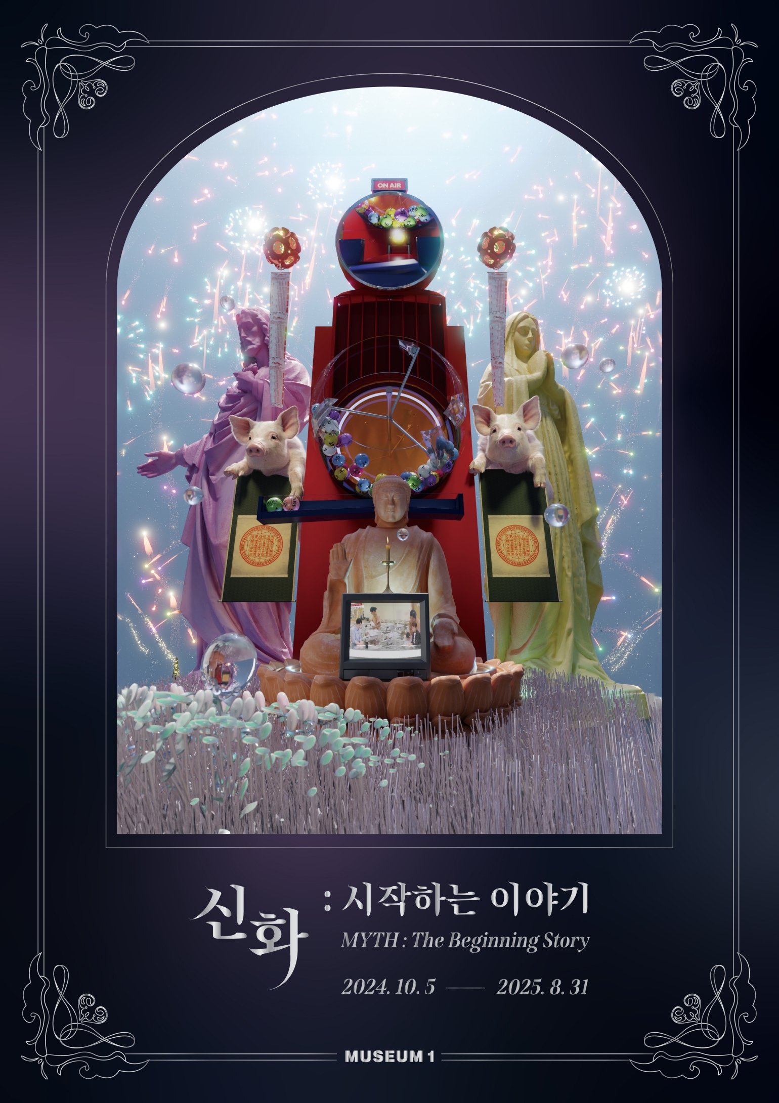 부산 센텀에 위치한 미술관 뮤지엄 원은 2024년 10월5일(토)부터 2025년 8월31일(일)까지 《신화 : 시작하는 이야기》를 개최한다. 5개국의 작가 18명(팀)이 참여했으며 회화, 사진, 설치, 영상, 미디어 아트 등 다양한 장르의 작품 약 100여 점을 감상할 수 있다.