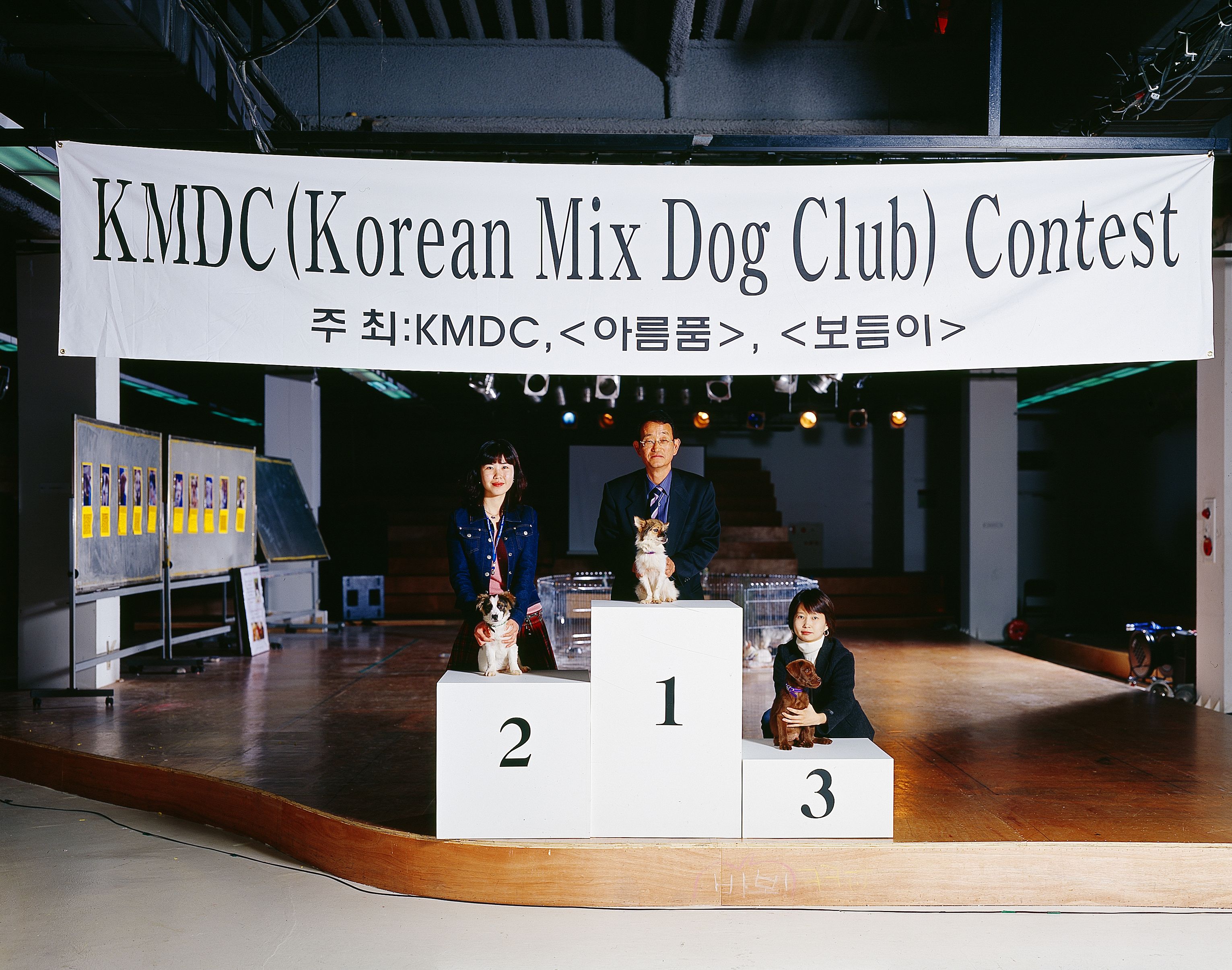 Each morning during the exhibition period, approximately ten dogs selected from a local shelter (with the principle that only mixed-breed dogs would be included) were transported to a series of cages installed inside the hall. Visitors were invited to vote for the dogs, ranking them on the spot, and the daily results were recorded through mock award-ceremony photographs taken on a small podium placed in the corner of the space.